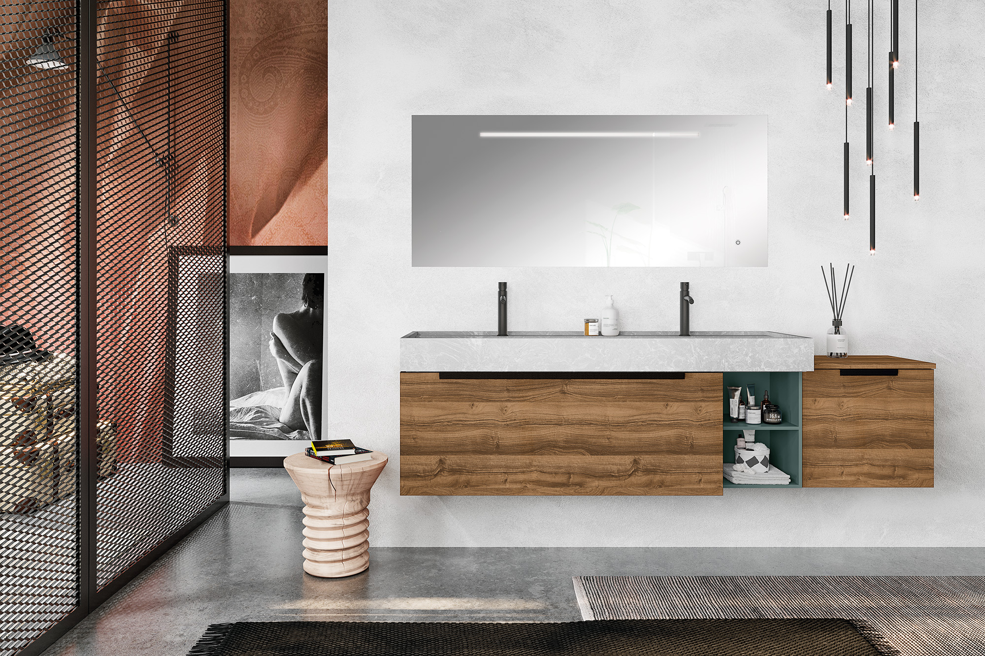 Un concepto de mueble compacto y modular, con armazones elegantes y minimistas, con multitud de sistemas de aperturas que se adaptan perfectamente a cualquier proyecto de baño.